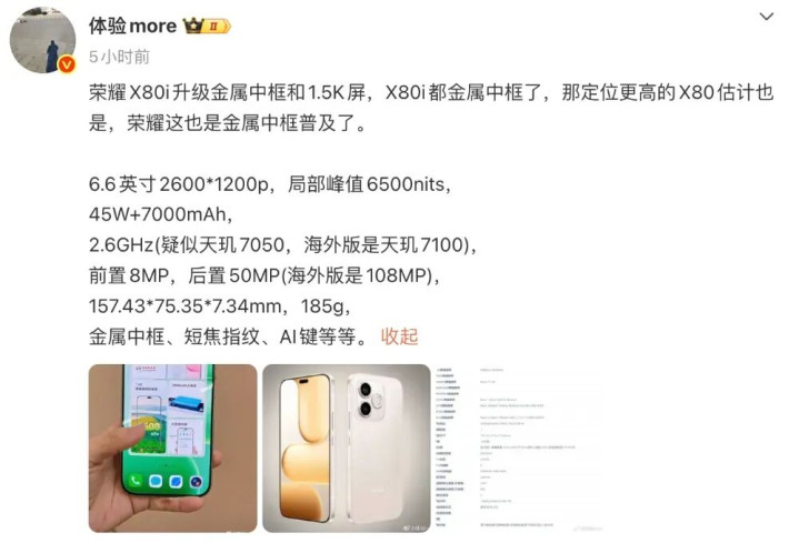 今天,博主@熊猫很禿然 的一份爆料中又提到了一款被称为“荣耀 X80i”的手机新品信息。