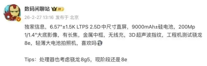 据悉,博主@数码闲说念站 的一份爆料中提到过一款新机,其配备6.57英寸傍边的1.5K LTPS 2.5D中尺寸直屏,内置9000mAh±硅电板。配备200Mp 1/1.4"大底影像,有长焦;配备金属中框,接济无线充、3D超声波指纹;工程机测试骁龙 8 至尊版处理器,定位粗疏大电板拍照机。