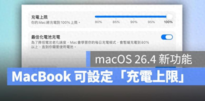而在日前推出的macOS 26.4 更新,苹果也在MacBook 上导入「充电上限」设定、还能辅导「慢速充电」;关于会介怀MacBook电板健康度或习气长时代插电使用的用户来说,会让电板情状更省心也更好掌控。