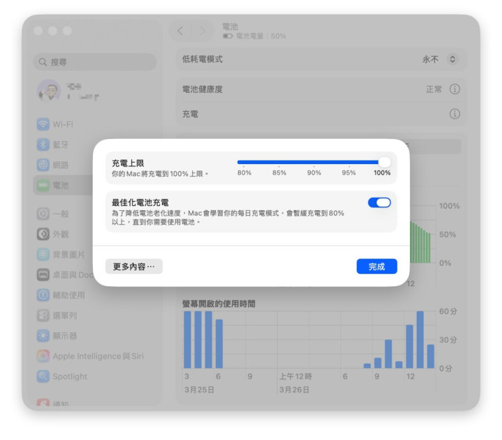 MacBook 会学惯用户的充电习气,再提倡用户设定适应的充电上限% 数。