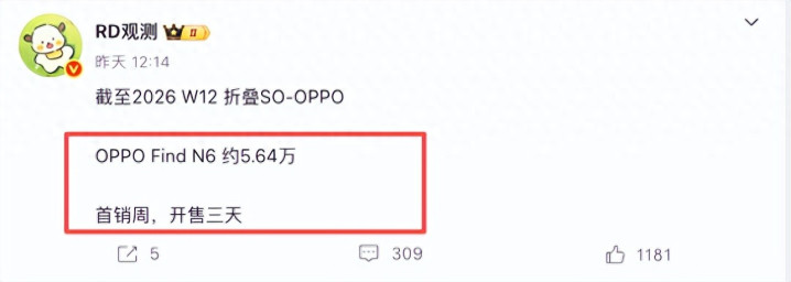 把柄博主RD不雅测的数据表现,OPPO Find N6这款新一代的折叠屏旗舰开售三天的销量达到了5.64万台!毫无疑问就这款折叠屏手机的销量收成亦然较为出色的,或者也就意味着OPPO的这款折叠屏旗舰真的成了!