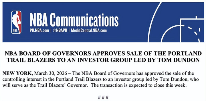 NBA官方文书,波特兰设备者队控股权将出售给汤姆-邓登指点的投资团队,往返展望本周完成。