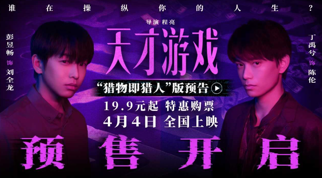 悬疑作歹电影《天才游戏》当天发布“猎物即猎东说念主”版预报,并同步开启寰宇预售!电影由程亮握导,彭昱畅、丁禹兮领衔主演,李蔓瑄主演,邓恩熙十分出演,侯雯元友情出演,将于4月4日寰宇上映。