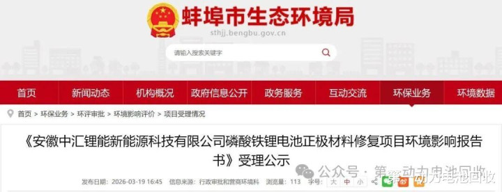第一能源电板回收讯息,近日,安徽省蚌埠市生态环境局发布了《安徽中汇锂能新能源科技有限公司磷酸铁锂电板正极材料设置名目环境影响敷陈书》受理公示。