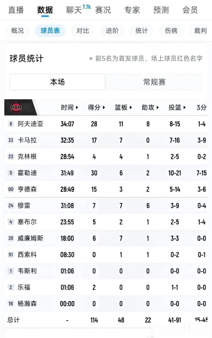全场技巧统计披露,开导者队4名球员得分达到两位数,霍勒迪投篮21次掷中10次,得到30分、6个篮板、2次助攻、2次抢断。阿夫迪亚得到28分、9个篮板、5次助攻。卡马拉得到17分。亨德森得到15分。快船队5名球员得分达到两位数。伦纳德得到23分,为全队最高。洛佩斯18分,科林斯16分,加兰14分,米勒12分,本场比赛开导者队得到114分,快船队得到104分,分差10分。