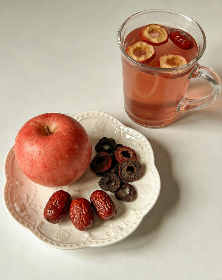 苹果1个与山楂干10克、红枣3颗共煮,酸甜开胃。山楂消食化积,红枣健脾益气,苹果均衡酸涩之性。此方稳妥饭后腹胀、食欲颓丧者,儿童亦可少许饮用,助消化而惠而不费。